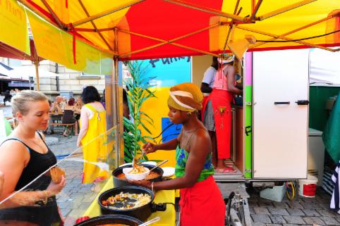 Es gibt Palmwein, Kokosbier und Essen aus Nordafrika, West- und Ostafrika (Kochbananen, Yam, Huhn mit Erdnusssosse, Yassa, Egussi u.v.m.),